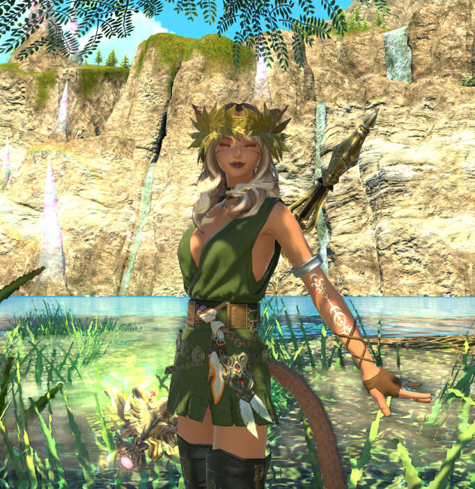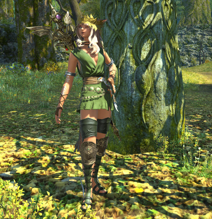 Personality: Often willing to help, sometimes insolent, perpetually sassy.Canon Job(s): White Mage, RogueAppearance: Sunny blonde hair and vivid aqua blue eyes. Green, revealing fabrics with crossing leather bindings on the legs and arms. Gladiator sandals Wears a golden circlet of olive branches atop her head.